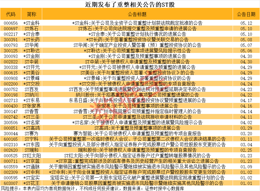 ST板块的破产重整同样暗藏机遇。据数据宝统计,今年以来,ST板块中披露了重整关键词公告的个股合计有30多只。最新披露的是*ST金科,公司5月11日晚发布了关于公司及全资子公司重整计划获法院裁定批准的公告;本周以来,公司股价也连续收获一字涨停。