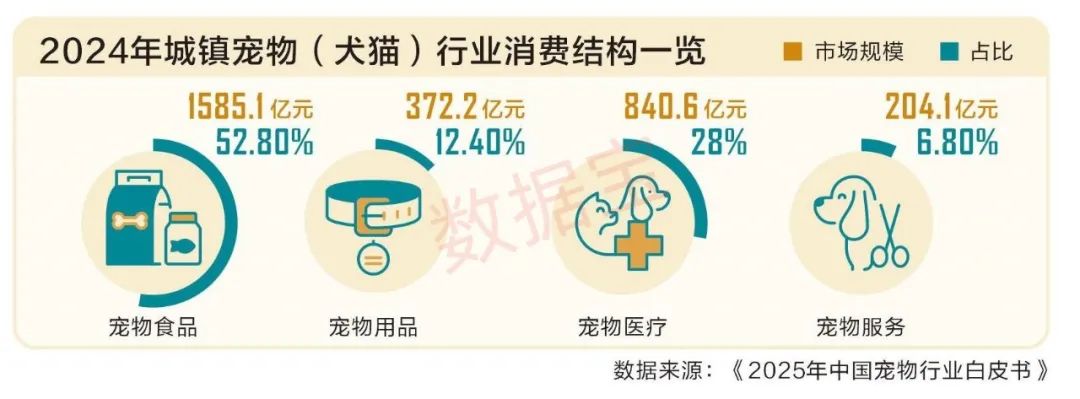细分领域中,宠物食品与宠物医疗规模领先,构成宠物经济的两大核心支柱。2024年,宠物食品市场规模1585.1亿元,占到宠物经济整体规模的52.8%;宠物医疗市场规模840.6亿元,占比28%。2018年至2024年,宠物食品与宠物医疗年均复合增长率依次为10.06%和16.39%,彰显强劲的消费活力。