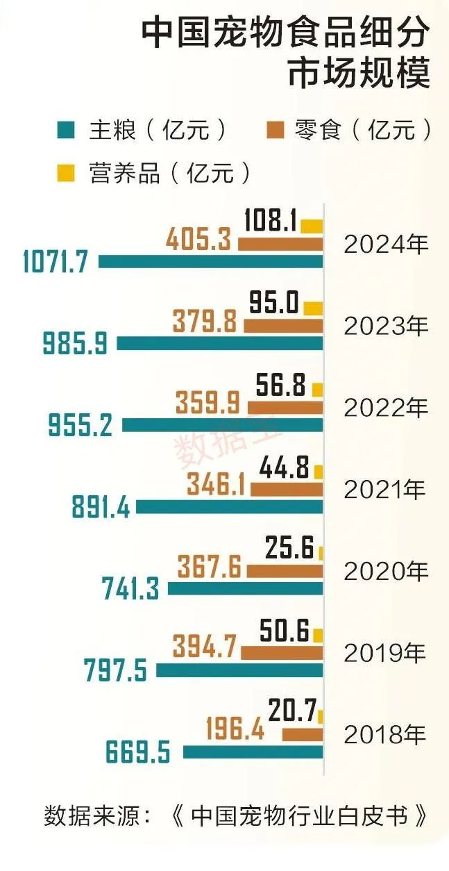 宠物食品分为主粮、零食和营养品三类。其中,主粮为最主要品类,其消费规模远超另外两项。2024年宠物主粮市场规模突破1000亿元,占到宠物消费市场的35.7%。