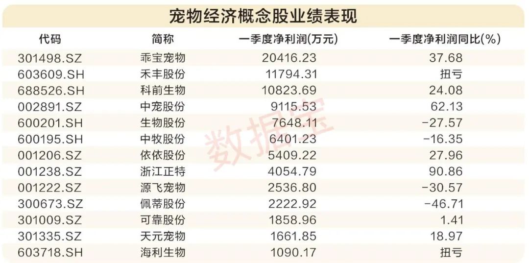从一季度盈利增速看,浙江正特、中宠股份净利润同比增幅居前,依次为90.86%、62.13%;乖宝宠物、依依股份、科前生物净利润增速均逾20%;禾丰股份、海利生物、狮头股份实现扭亏为盈。