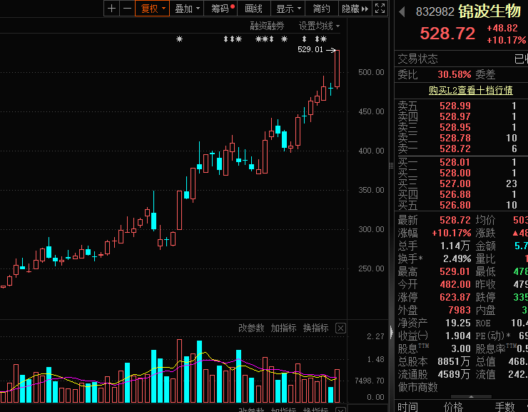 5月19日,锦波生物(832982)大涨10.17%,收盘价528.72元/股,创下历史新高,为北交所首只股价突破500元的个股,最新A股市值升至468亿元,今年以来累计上涨达到155.42%。目前,该股稳居北交所第一高价股宝座,同时排名A股第3位,相比去年底排名上升16位。