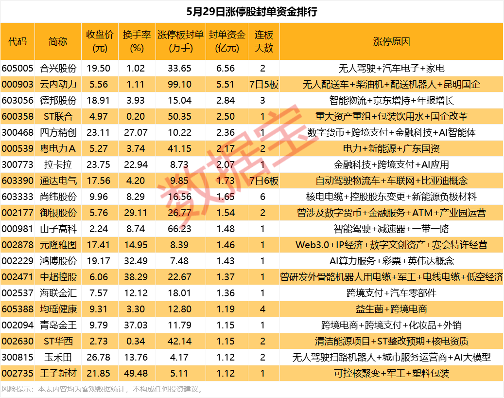 值得关注的是,封单资金靠前的合兴股份和云内动力均为智能驾驶概念股。消息面上,5月27日,交通运输部科技司创新发展处副处长赵晓辉透露,交通运输部正全力推动“人工智能+交通运输”行动,顶层设计《“人工智能+交通运输”实施意见》已完成征求意见工作,将加快出台。