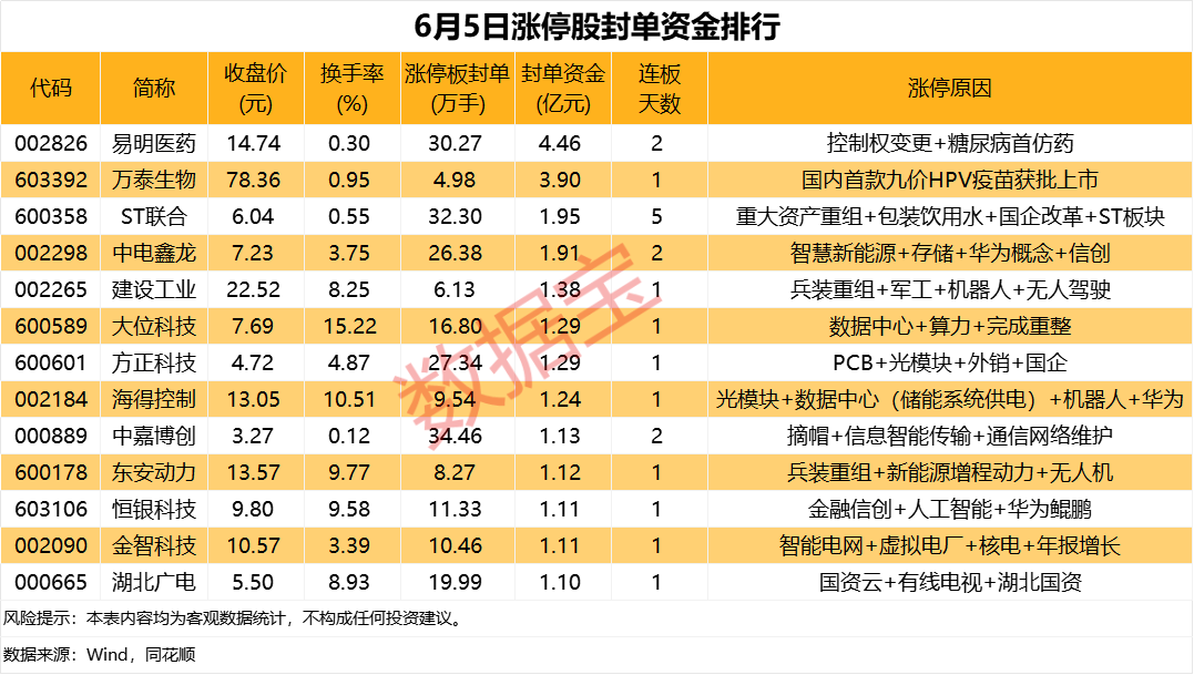 据证券时报·数据宝统计,6月5日,从收盘涨停板封单量看,中嘉博创、ST联合、易明医药排名前三,分别为34.46万手、32.30万手、30.27万手;方正科技和中电鑫龙紧随其后,封单量均在25万手以上。
