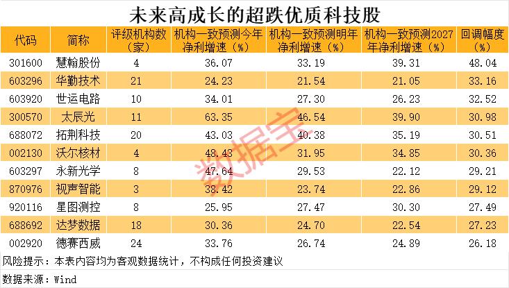 从回调幅度来看,慧翰股份、华勤技术、世运电路、太辰光等个股最新价较年内高点均跌超30%。