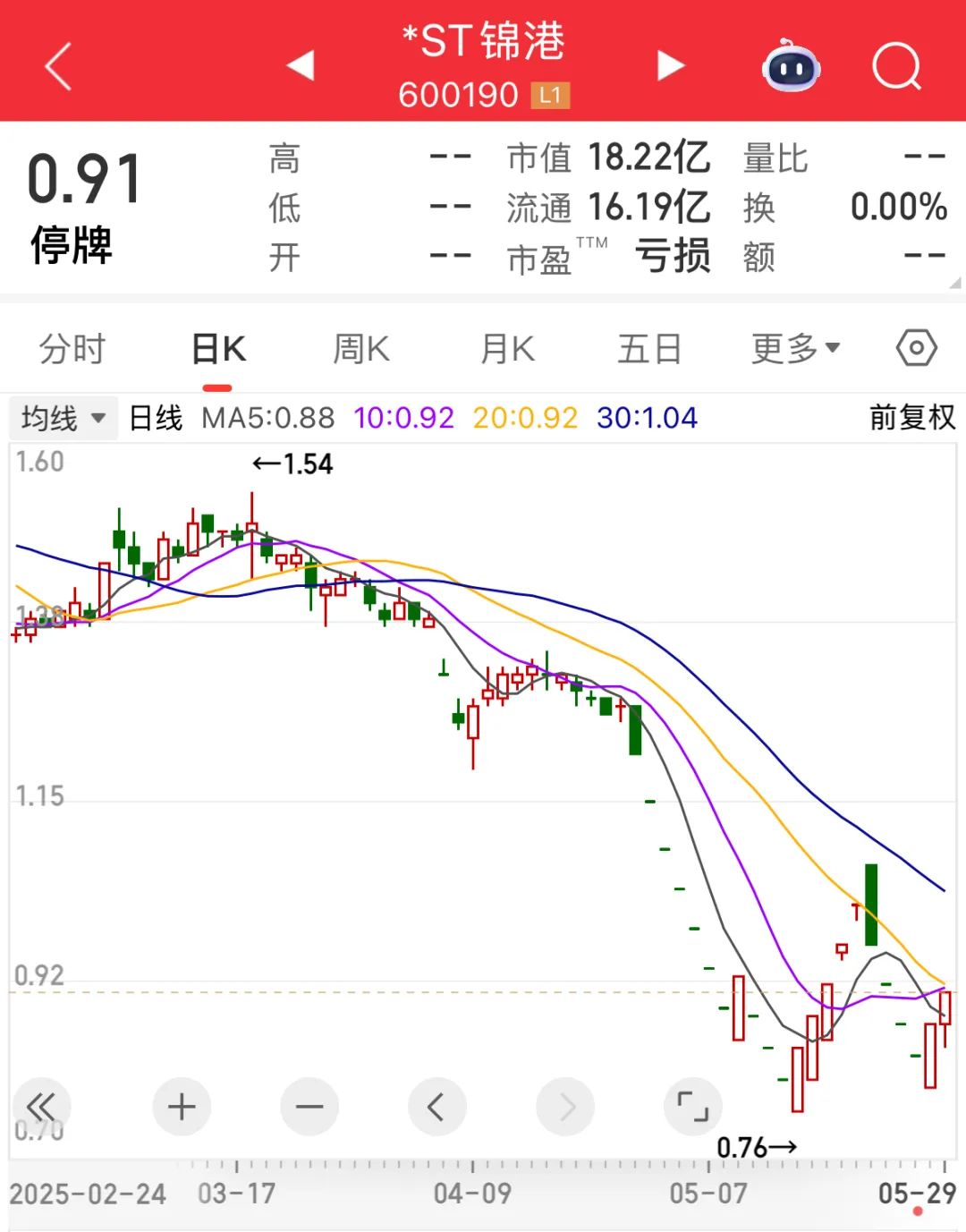 昨日晚间,*ST锦港公告称,公司于2025年6月20日收到上海证券交易所出具的自律监管决定书,决定终止公司股票上市。终止上市的证券种类包括人民币普通股(A股)和境内上市外资股(B股),证券简称为*ST锦港、*ST锦港B,证券代码为600190、900952。公司股票进入退市整理期的起始日为2025年6月30日,预计最后交易日期为2025年7月18日,退市整理期的交易期限为15个交易日。