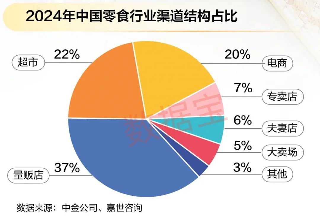 “三分零食天下,量贩店有其一”,这句话放到当前的零食市场,并不为过。根据中金公司和嘉世咨询的数据,2024年中国零食消费渠道中,量贩店占比高达37%,遥遥领先;超市占比22%,电商占比20%,且两者比例逐年下降;专卖店、夫妻店和大卖场等占比靠后,均不足10%。