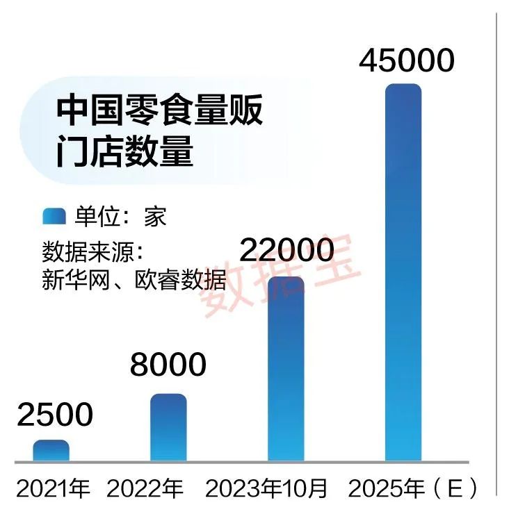 量贩品牌大多选择以加盟为主的经营模式来实现规模的快速扩张。根据新华网和欧睿数据,2022年中国零食量贩门店数量约8000家,到2023年10月这一数字就飙涨到了22000家,增长175%。预计到2025年,中国零食量贩门店数量将再翻一番,有望冲至45000家。
