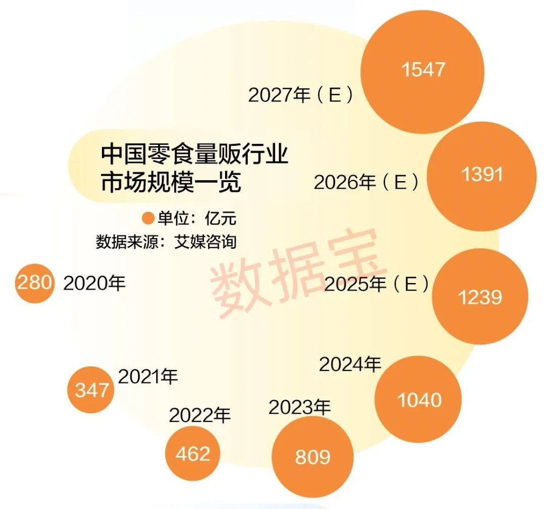 依靠上述优势,量贩模式迅速打开国内市场,规模一飞冲天。根据艾媒咨询数据,2024年中国零食量贩市场规模约1040亿元,同比增长28.6%;预计到2027年,中国零食量贩市场规模有望突破1500亿元,达到1547亿元。