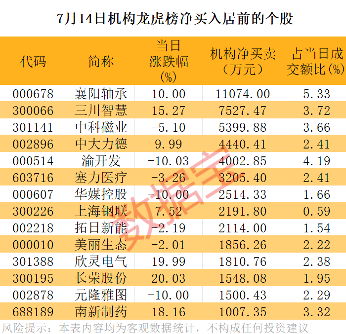 7月14日,龙虎榜中机构席位资金净买入0.22亿元,其中,净买入的个股19只,净买入超1000万元的有14股;净卖出的个股16只。