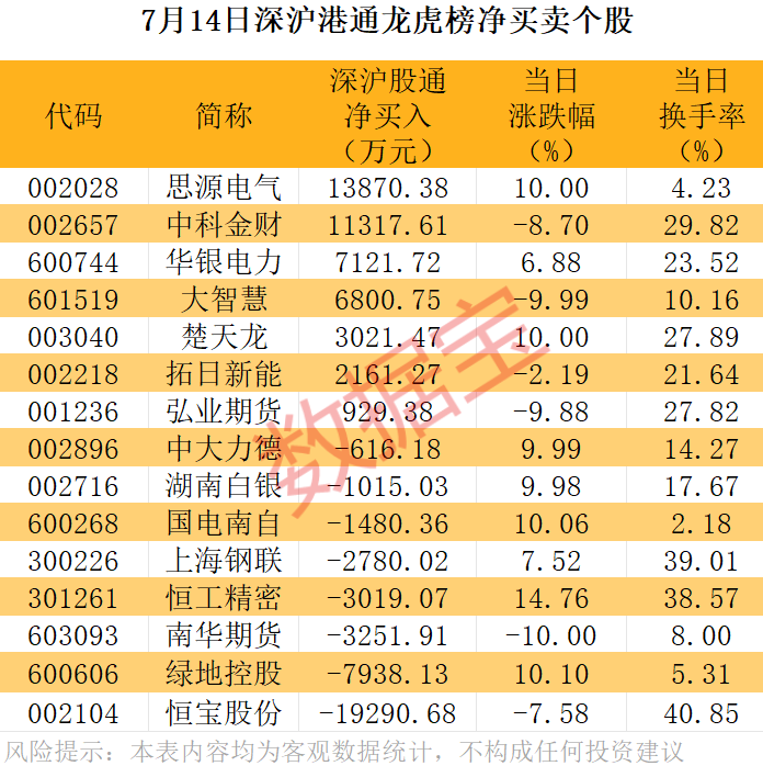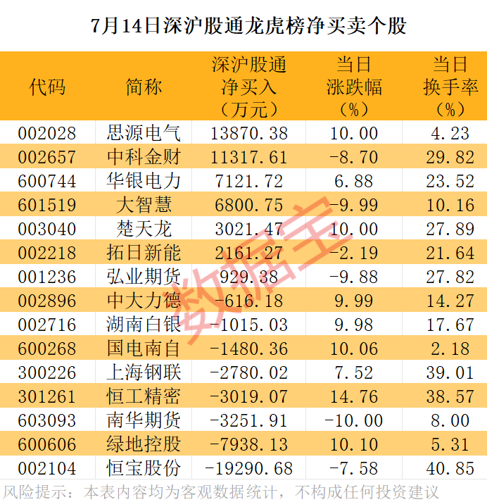 7月14日,深股通及沪股通席位共现身15只个股龙虎榜,净买入居前的有思源电气、中科金财、华银电力等。