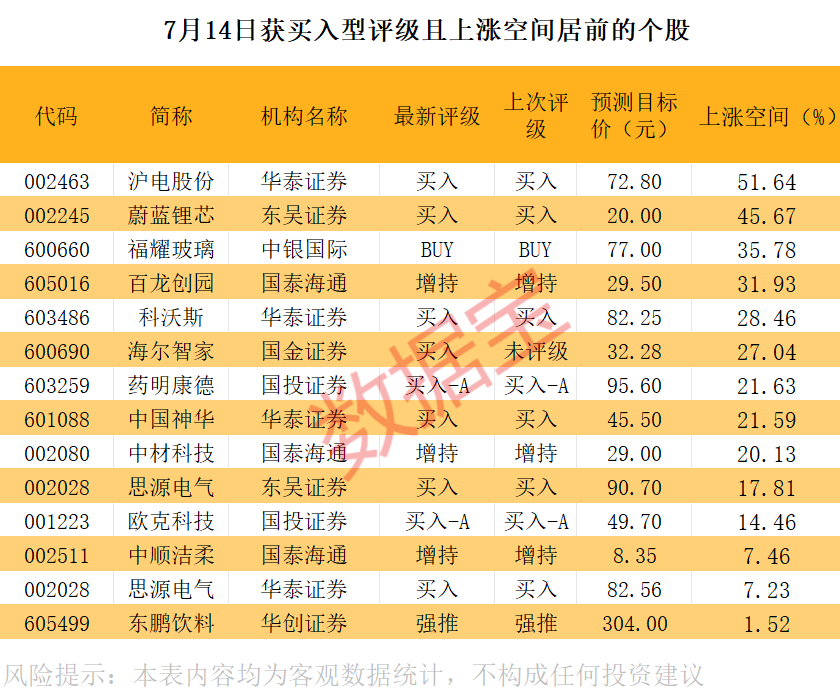 获机构买入型评级个股中,共有14条评级记录中对相关个股给出了未来目标价。以公布的预测目标价与最新收盘价进行对比显示,共有9股上涨空间超20%,沪电股份上涨空间达51.64%;上涨空间较高的个股还有蔚蓝锂芯、福耀玻璃等,上涨空间分别为45.67%、35.78%。