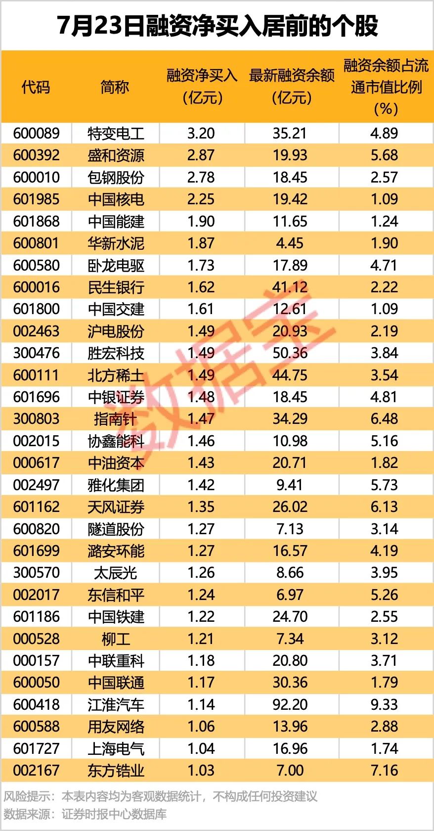 据证券时报·数据宝统计,具体到个股,7月23日共有1841股获融资净买入,净买入金额在千万元以上的有509股,其中30股融资净买入额均超1亿元。