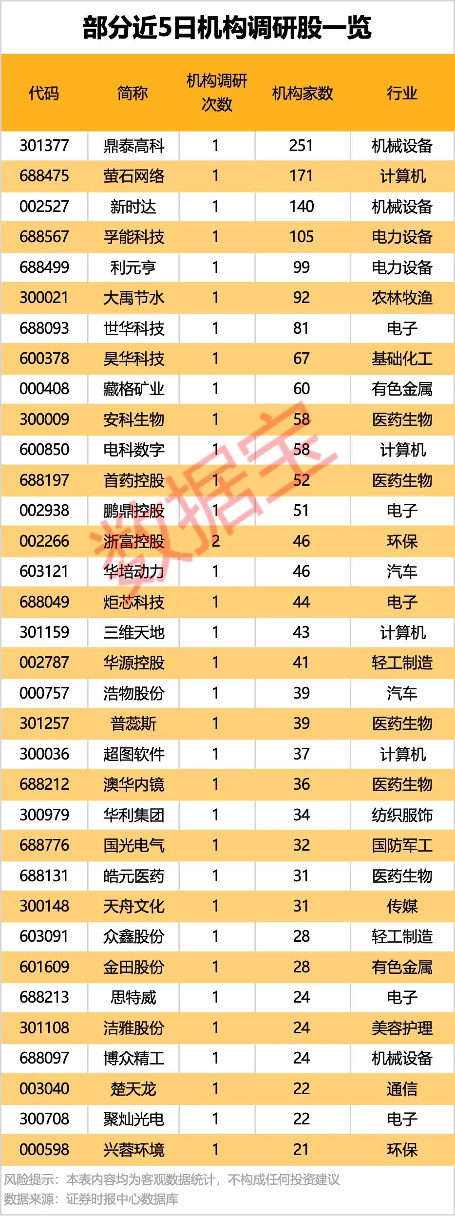 机构调研榜单中,共有34股获20家以上机构扎堆调研。鼎泰高科最受关注,参与调研的机构达到251家;萤石网络被171家机构调研,榜单中排名第二;新时达、孚能科技分别被140家、105家机构调研。