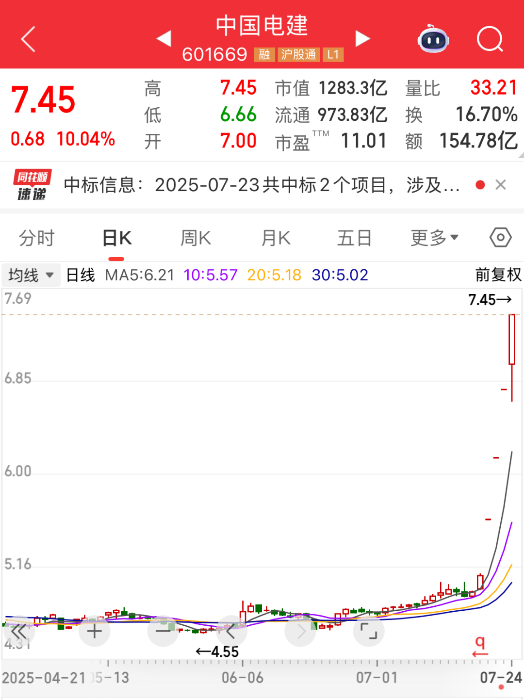中国电建(601669)早盘再度涨停,成交额154.78亿元,位居A股成交额首位;目前该股已连续4个交易日涨停,股价创近2年来新高。