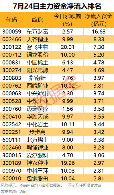 东方财富主力资金净流入16.63亿元,居首;天齐锂业净流入金额达8.33亿元,居次席。