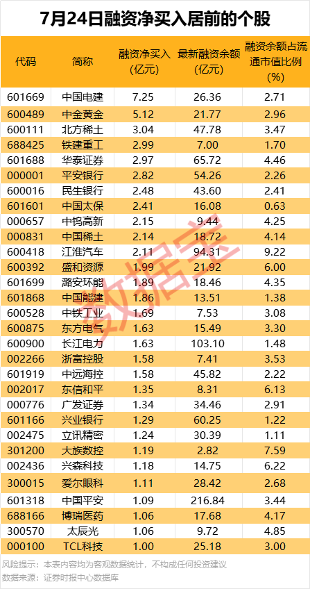 据数据宝统计,具体到个股,7月24日共有1965股获融资净买入,净买入金额在千万元以上的有559只,其中30只融资净买入额均超亿元。中国电建融资净买入额居首,当日净买入7.25亿元;其次是中金黄金、北方稀土,融资净买入金额分别为5.12亿元、3.04亿元;融资净买入金额居前的还有铁建重工、华泰证券、平安银行等。