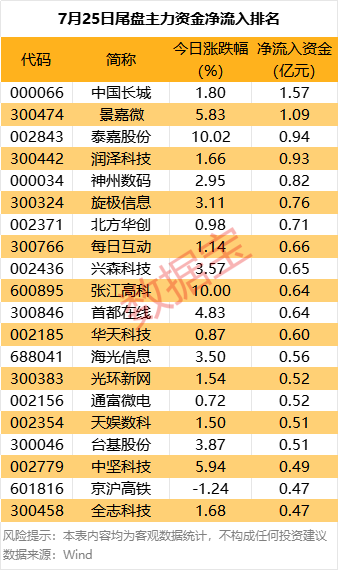 此外,景嘉微、泰嘉股份、润泽科技等尾盘主力资金净流入居前。