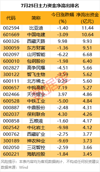 比亚迪主力资金净流出金额居首,达11.44亿元。此外,还有中国电建、西藏天路和东方财富等个股主力资金净流出居前。