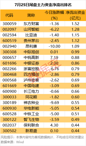 尾盘净流出方面,17股尾盘主力资金净流出均超0.5亿元,5股尾盘主力资金净流出均超1亿元。其中,东方财富尾盘主力资金净流出居首,达1.52亿元。