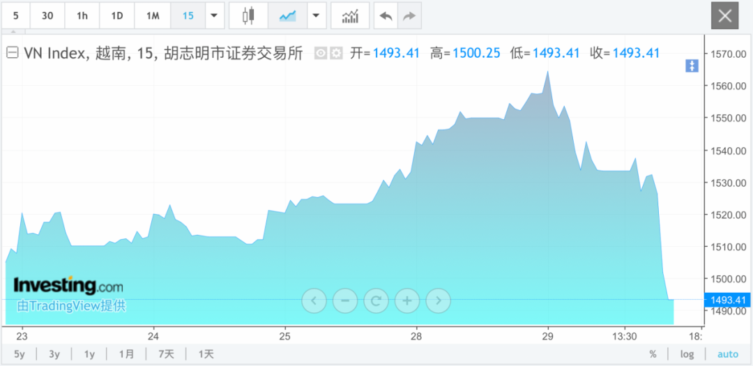 当地时间7月29日,越南股市突然大跳水,越南胡志明指数(VN Index)盘中一度暴跌4.3%,截至收盘,跌幅仍达4.11%,报1493.41点;越南VN30指数亦暴跌4.38%,报1621.29点。