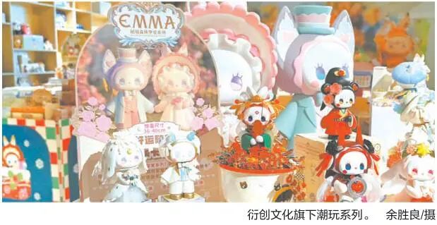 “我们2019年就推出自己的潮玩品牌,是最早做自有IP的公司之一。”陈守丽介绍道。她拿起一个玩偶,这是“EMMA”——公司自主设计的品牌。店里大大小小的EMMA形态各异:有的坐在地上,脚朝前;有的戴着硕大且样式繁复的帽子;有的站着,穿着各式好看的衣服。无论什么样式,它们的眼睛的形状和表情大致相同。