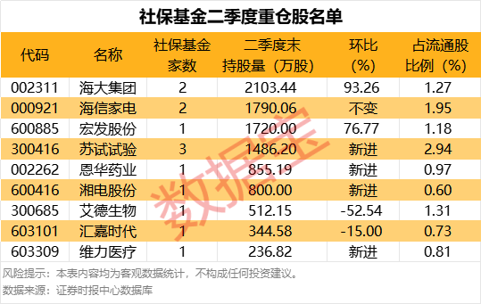 从持股比例看,社保基金持有比例最多的是苏试试验,持股量占流通股比例为2.94%;其次是海信家电,社保基金持股比例为1.95%;持股比例居前的还有艾德生物、海大集团、宏发股份等。持股数量方面,社保基金持股量最多的是海大集团,共持有2103.44万股。