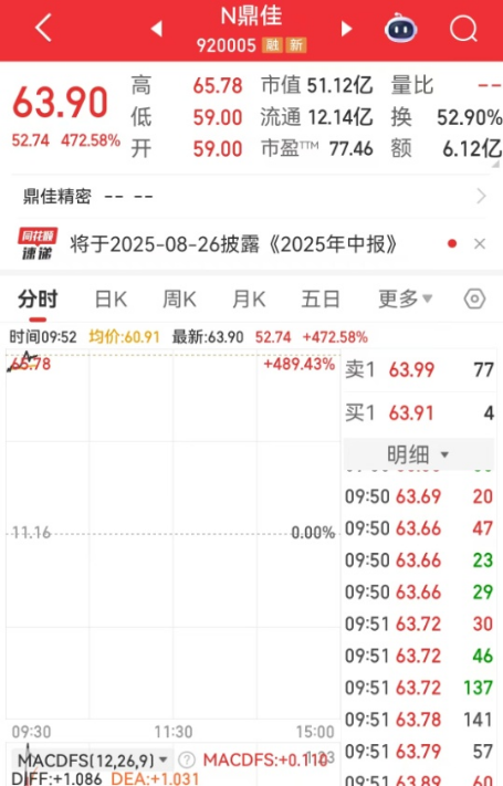 N鼎佳(920005)今日在北交所上市,开盘价59元,开盘上涨428.67%。