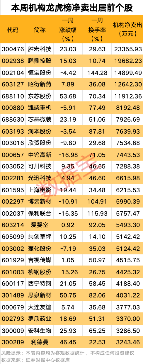 机构净卖出的个股中,净卖出金额最多的是胜宏科技,该股本周累计上涨23.03%,一周换手率为29.63%。