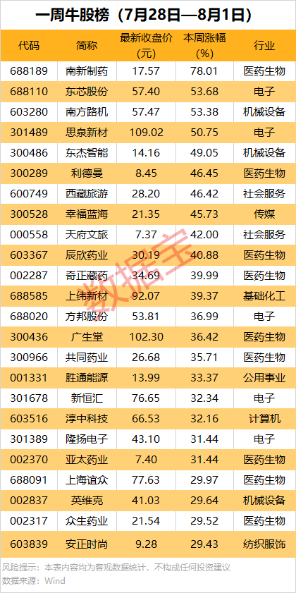 本周涨超30%的个股中,按所属行业统计,医药生物行业个股最多,共7股上榜;其次是电子行业,有5股上榜。