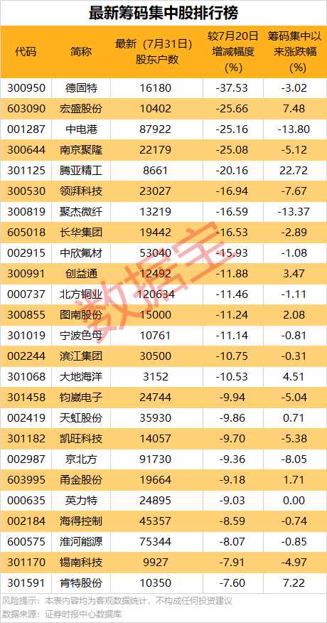 股东户数降幅最多的是德固特,截至7月31日最新股东户数为16180户,较7月20日下降37.53%;筹码集中以来该股累计下跌3.02%,累计换手率为182.33%。