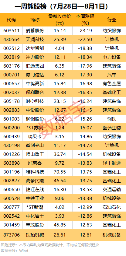 本周累计下跌的个股中,46股跌幅在10%以上,爱慕股份和天润科技累计跌幅均超20%。