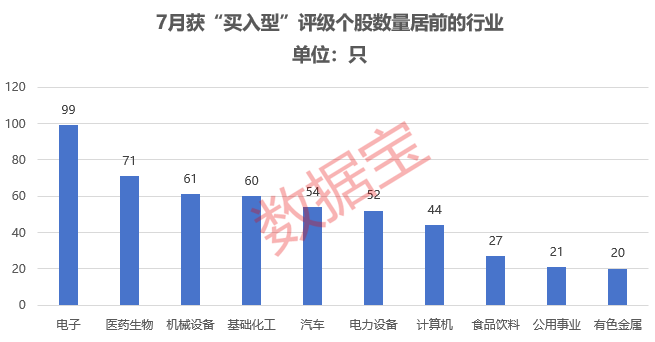 据证券时报·数据宝统计,7月,60家机构合计进行1482次“买入型”(包括买入、增持、推荐、强烈推荐、强烈买入)评级,合计覆盖720股。