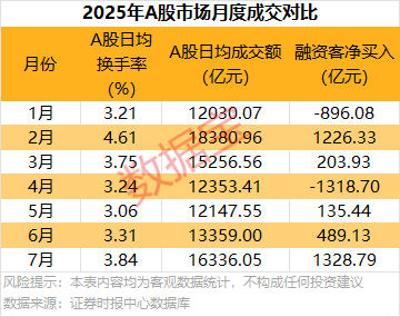 根据Wind数据,从成交活跃度来看,以市值计算,7月,A股市场日均换手率和日均成交额分别为3.84%和1.63万亿元,均创3月以来新高。