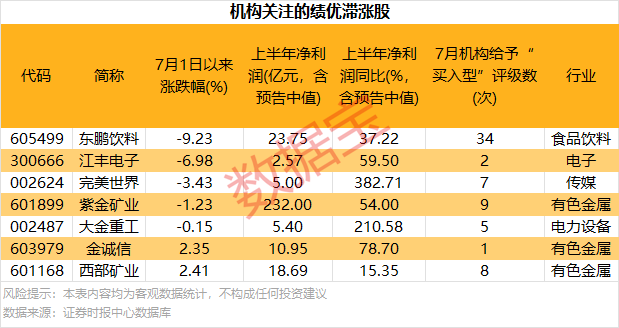 上述103股中,东鹏饮料和江丰电子等7股7月以来股价跑输上证指数,且2025年上半年业绩同比增长(含半年报、业绩预告)。