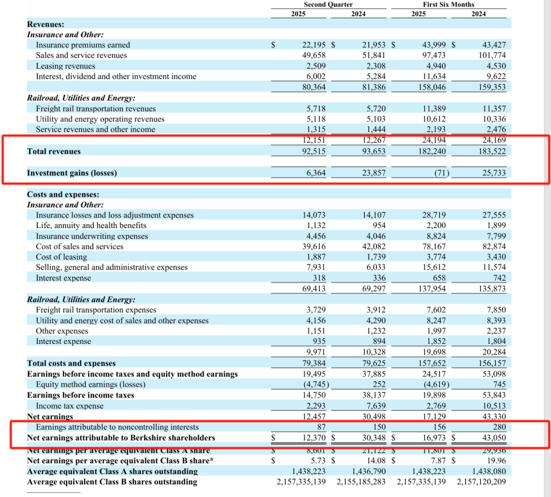 伯克希尔公布的财报显示,当季度公司营收925.15亿美元,去年同期为936.5亿美元,同比下降1.2%;归属股东净利润123.7亿美元,去年同期净利润为303.5亿美元,同比降59%,反映出其普通股持有的整体投资收益下降,以及对卡夫亨氏(KHC.US)的减记;营业利润111.6亿美元,同比下滑3.8%,上年同期为116亿美元;第一季度为96.4亿美元,同比下滑14.1%,这是自2020年第三季度营业利润下降32.1%以来的最大降幅。