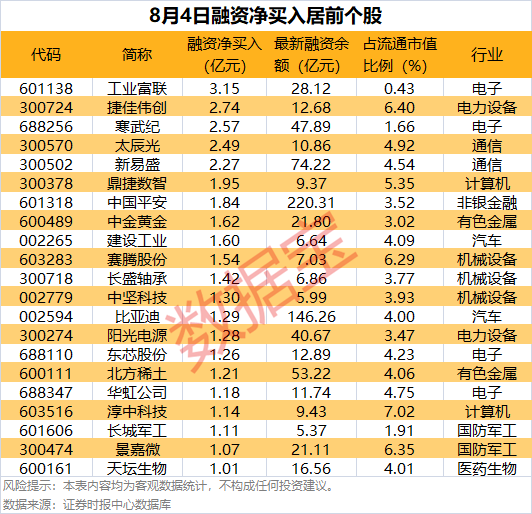 具体到个股,8月4日获融资净买入千万元以上的有511只,其中21只融资净买入额均超1亿元。工业富联融资净买入额居首,当日净买入3.15亿元,其次是捷佳伟创、寒武纪,融资净买入金额分别为2.74亿元、2.57亿元,融资净买入金额居前的还有太辰光、新易盛、鼎捷数智等。
