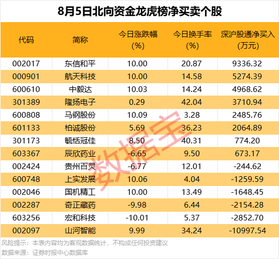 今日龙虎榜现身个股中,8股获北向资金净买入,净买入居首的是东信和平,金额为9336.32万元;其次是航天科技、中毅达,分别获净买入5274.39万元、4968.62万元。