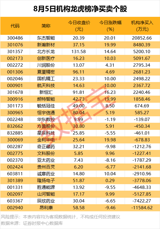 今日龙虎榜中,机构席位净买入12股,净卖出14股。东杰智能获机构净买入2.09亿元;净买入居前的还有新瀚新材、北方长龙、创新医疗,机构净买入金额均超5000万元。