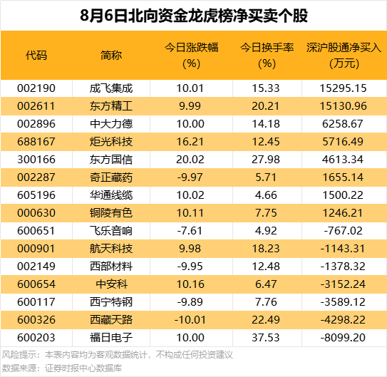 今日龙虎榜现身个股中,8股获北向资金净买入,净买入居前的是成飞集成、东方精工,金额均超1.5亿元;其次是中大力德、炬光科技,分别获净买入6258.67万元 、5716.49万元。