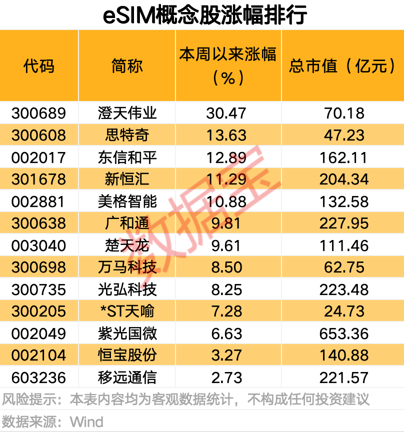 本周以来,eSIM概念连续上涨,布局eSIM产业链的13股本周以来平均涨幅达到10.4%,澄天伟业、思特奇、东信和平、新恒汇等个股累计涨幅均在10%以上。