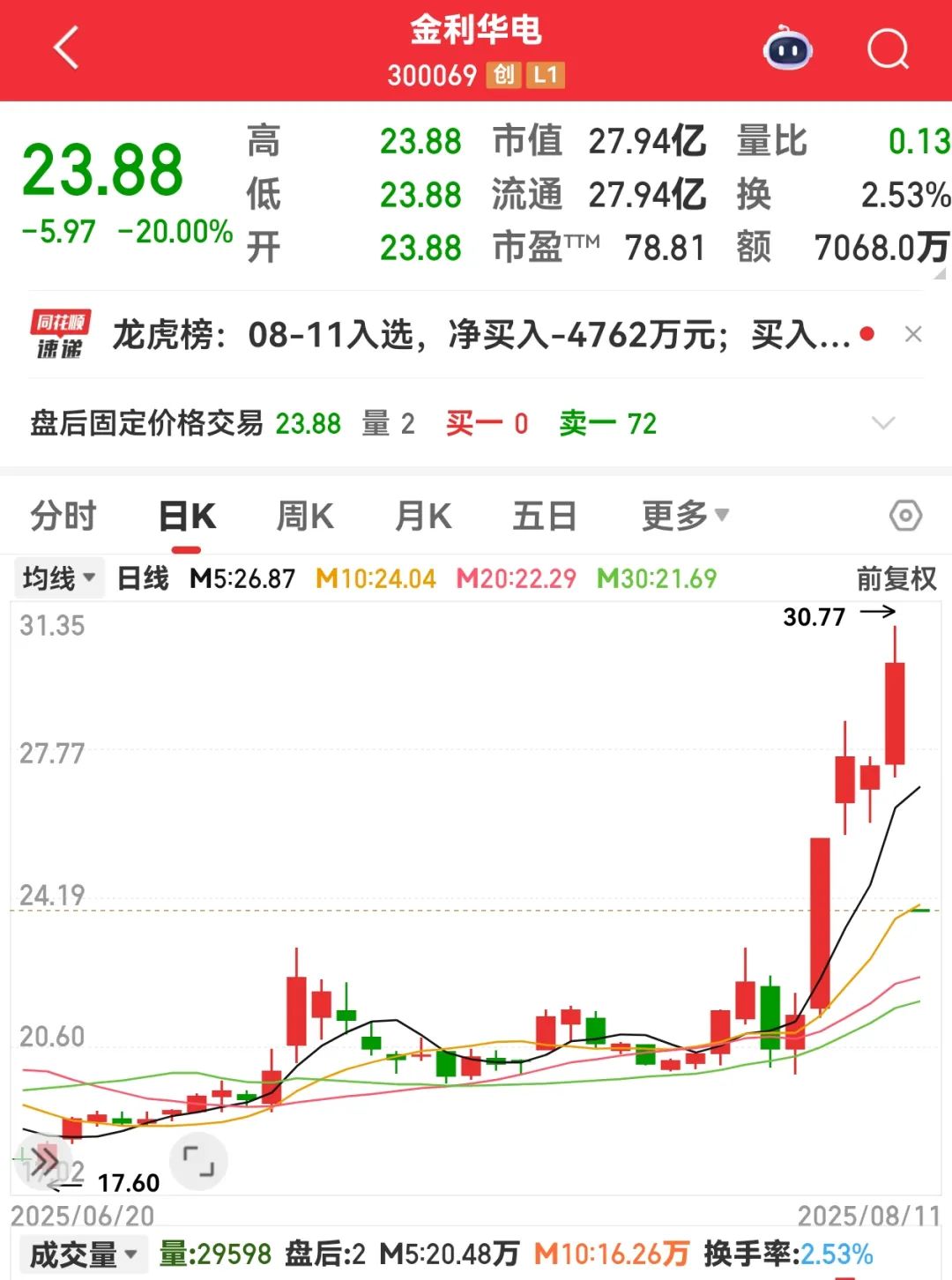 截至今日收盘,跌幅最大的是金利华电(300069),该股今日一字跌停,收盘跌幅为20%,跌停板封单为13.61万手。上周五(即8月8日)盘中,该股达到七年来最高价30.77元/股,最高价与2024年以来低点相比,最大涨幅一度达到4倍以上。