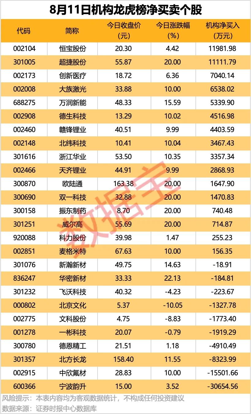 机构净卖出个股中,宁波韵升遭机构净卖出3.07亿元,居首;其次是中欣氟材、北方长龙,分别遭净卖出1.55亿元、8323.99万元。
