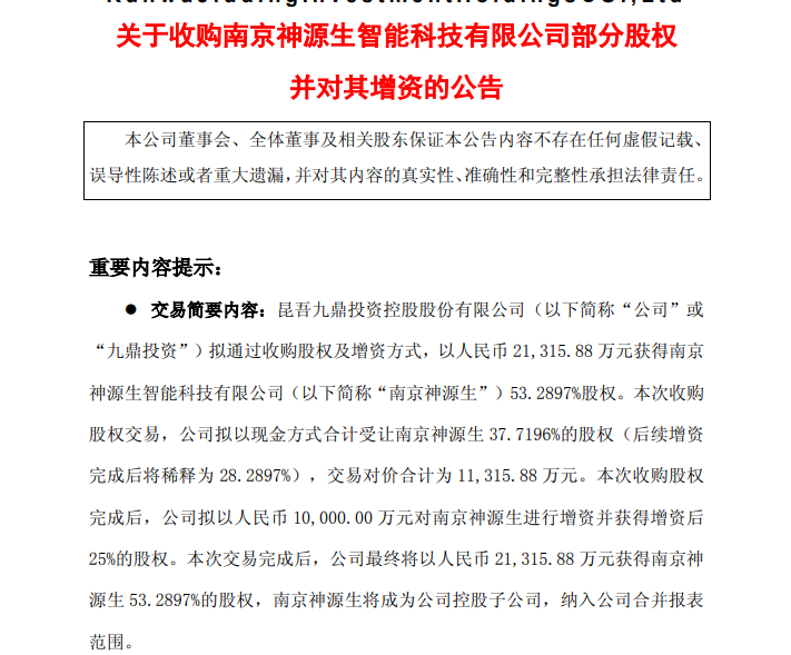 8月11日晚间,九鼎投资披露重磅公告,公司拟通过收购股权及增资方式,以人民币2.13亿元获得南京神源生智能科技有限公司(以下简称“南京神源生”)53.2897%股权。南京神源生将成为公司控股子公司,纳入公司合并报表。