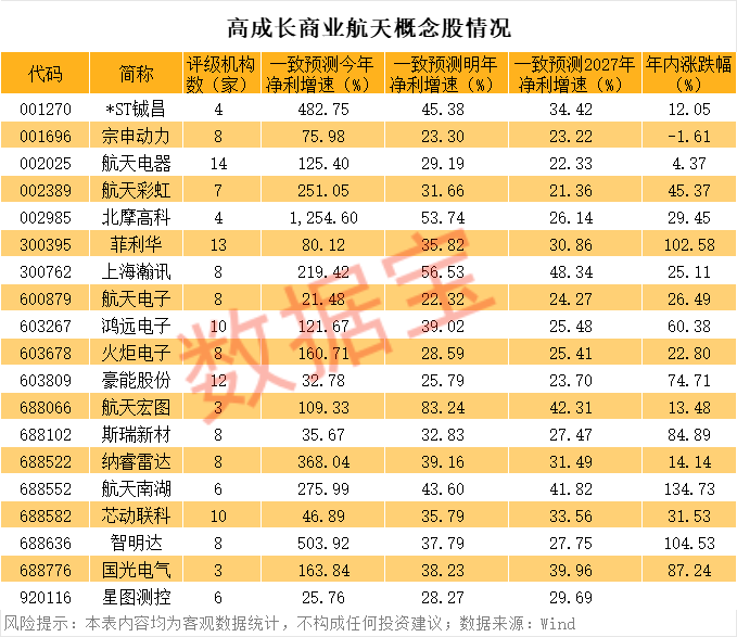 从成长性来看,根据机构一致预测,*ST铖昌、宗申动力、航天电器等个股今年、明年及2027年净利润增速均超20%,其中*ST铖昌、菲利华、上海瀚讯等三年净利增速均超30%。