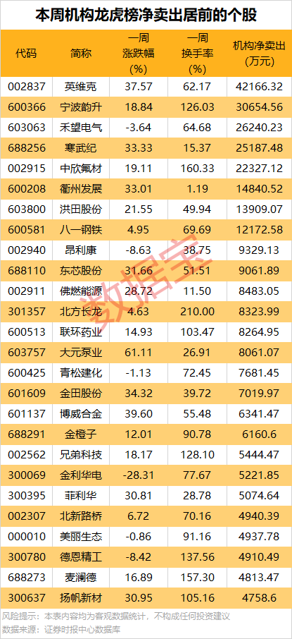 一周机构累计净卖出的个股中,8股金额均超1亿元,其中净卖出金额最多的是英维克,达4.22亿元。该股本周累计上涨37.57%,一周换手率为62.17%,因连续三个交易日内,涨幅偏离值累计达28.28%等1次上榜龙虎榜,买卖居前营业部中机构合计净卖出4.22亿元;同时上榜的还有深股通专用席位,净卖出2.35亿元,营业部席位一周合计净买入2362.75万元。