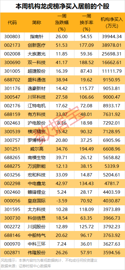 一周龙虎榜净买入金额最多的是指南针,该股本周上涨26%,一周换手率为54.55%,累计成交额为314.27亿元。因日收盘价涨幅达20%等1次上榜龙虎榜,买卖居前营业部中机构合计净买入3.99亿元;同时上榜的还有深股通专用席位,净买入4.48亿元,营业部席位一周合计净买入2.8亿元。
