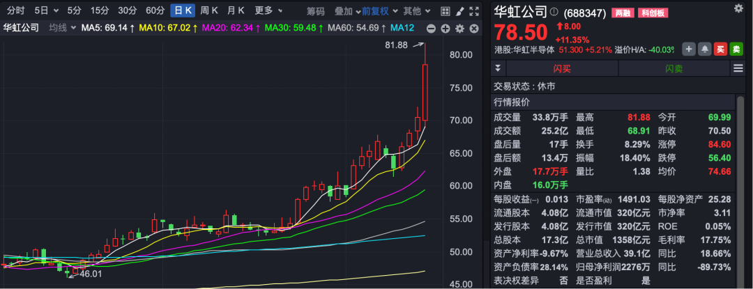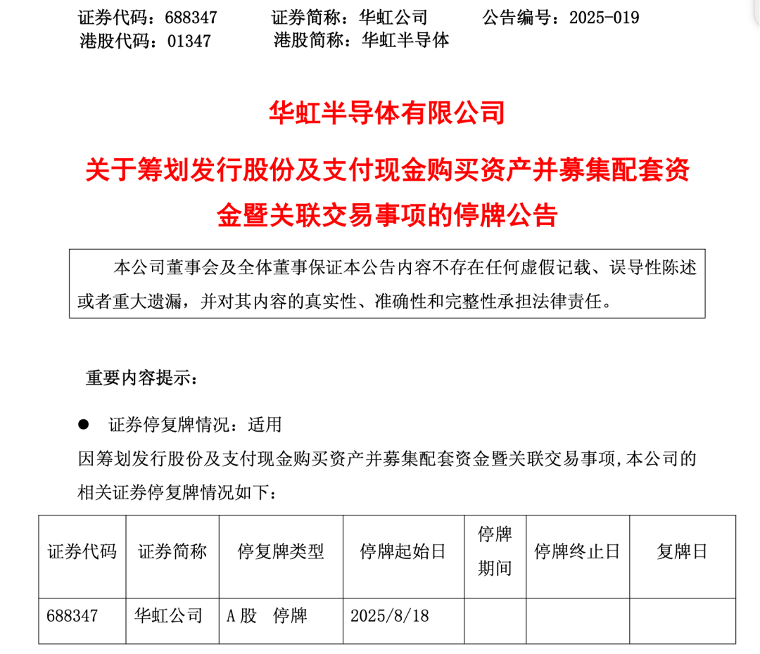 8月17日,科创板公司华虹公司(688347)公告,因筹划发行股份及支付现金购买资产并募集配套资金暨关联交易事项,公司自8月18日开市起停牌。