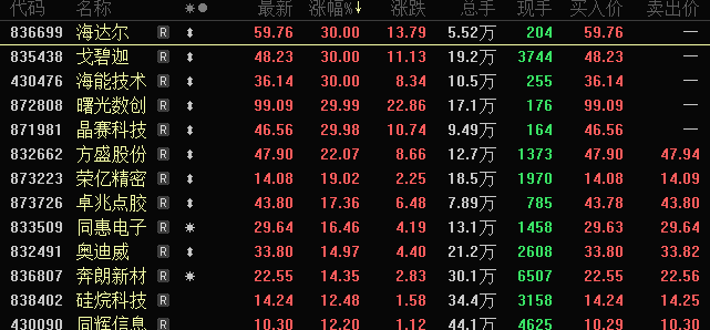 共5只北交所股票录得“30cm”涨停板,分别是戈碧迦、海能技术、海达尔、曙光数创、晶赛科技。今日北交所交易的271只股票中,仅5只下跌。