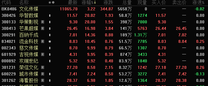 今日盘面上,短剧概念股集体发力。华智数媒、华策影视、芒果超媒、百纳千成盘中均触及“20cm”的涨停板。收盘时,华智数媒、华策影视、慈文传媒、吉视传媒、欢瑞世纪涨停。