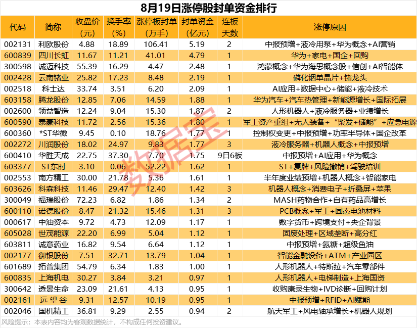 以封单金额计算,21股封单资金超1亿元,利欧股份、四川长虹、诚迈科技封单资金居前,分别为5.19亿元、4.79亿元、2.48亿元。